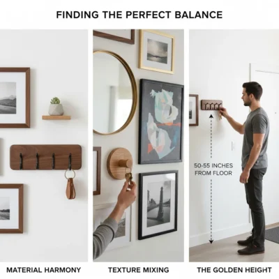 Texture Mixing: Don’t just stick to flat frames. The 3D nature of a wooden key holder adds depth. Contrast the organic wood grain with the smooth glass of a mirror or the soft texture of a canvas print.