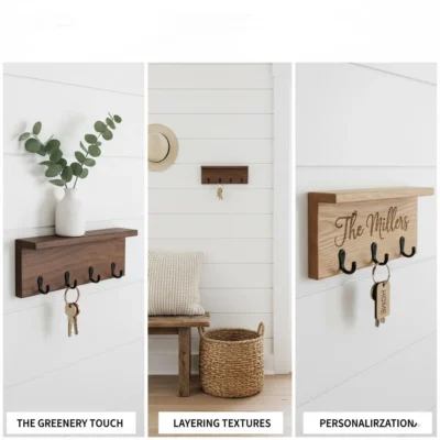 The Greenery Touch: Wood and green are a match made in heaven. Place a small sprig of dried eucalyptus or a tiny succulent on the shelf of your key holder. It adds a pop of life and color.